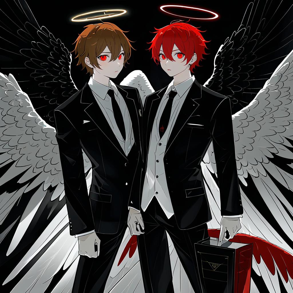 Digital anime-style artwork featuring two male characters dressed in formal black suits with white shirts and black neckties. Both have red eyes and distinct hair colors—one with brown hair and the other with red hair. Each character has white feathered angel wings and a glowing halo above their heads, set against a dark background. The illustration reflects a formal, supernatural theme inspired by Chainsaw Man.