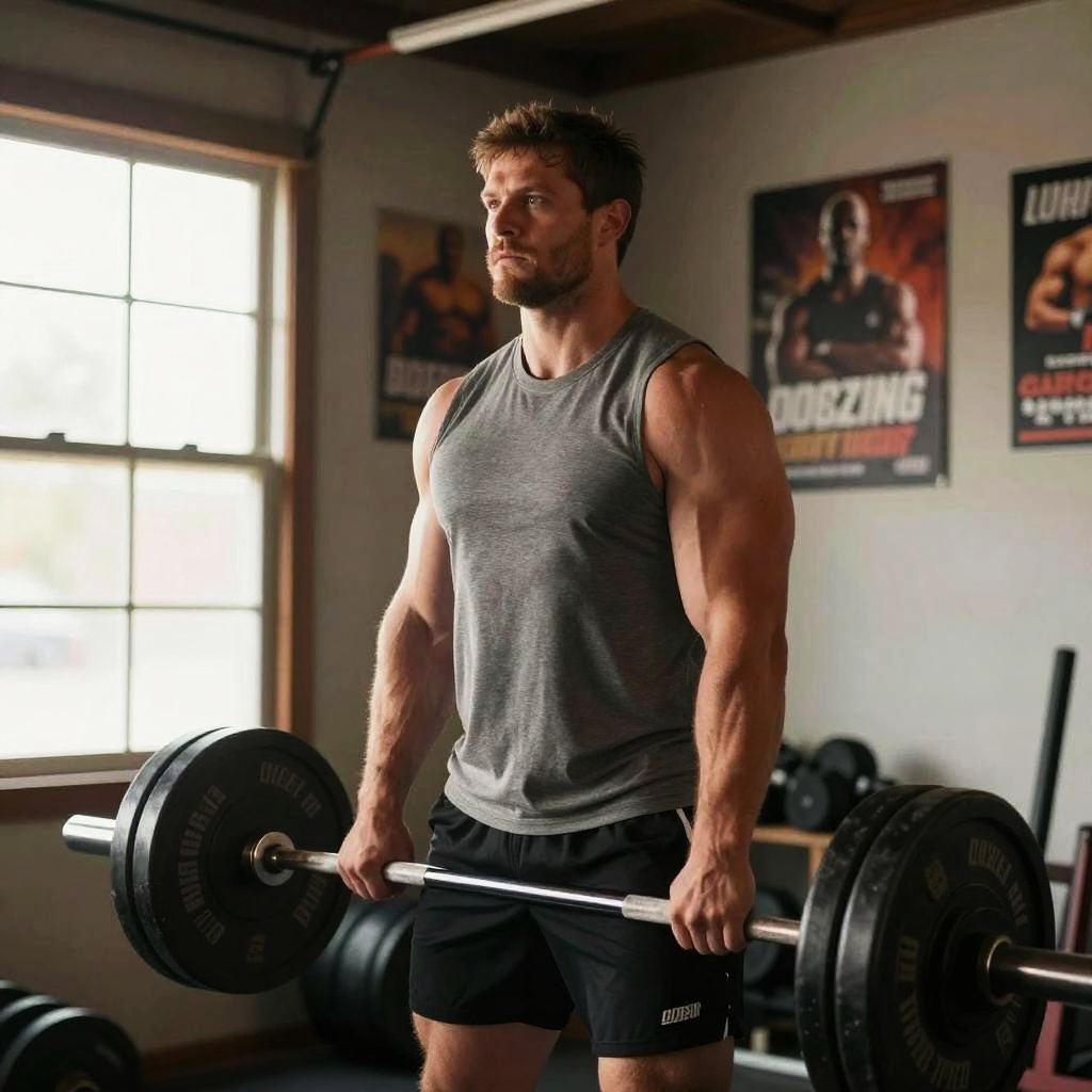Beefy dad bod lifting weights in a home garage gym, sleeveless shirt showing powerful arms and solid frame, motivational posters on walls, early sunlight filtering through windows, focused yet approachable energy.