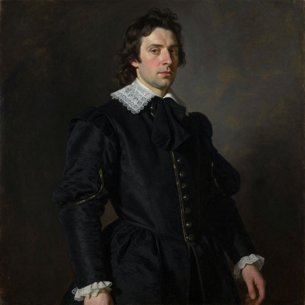 Portrait of a handsome man in a black outfit, a flemish baroque clothes by alexander mcqueen, art by john collier by greg rutkowski and craig mullins, oil on canvas