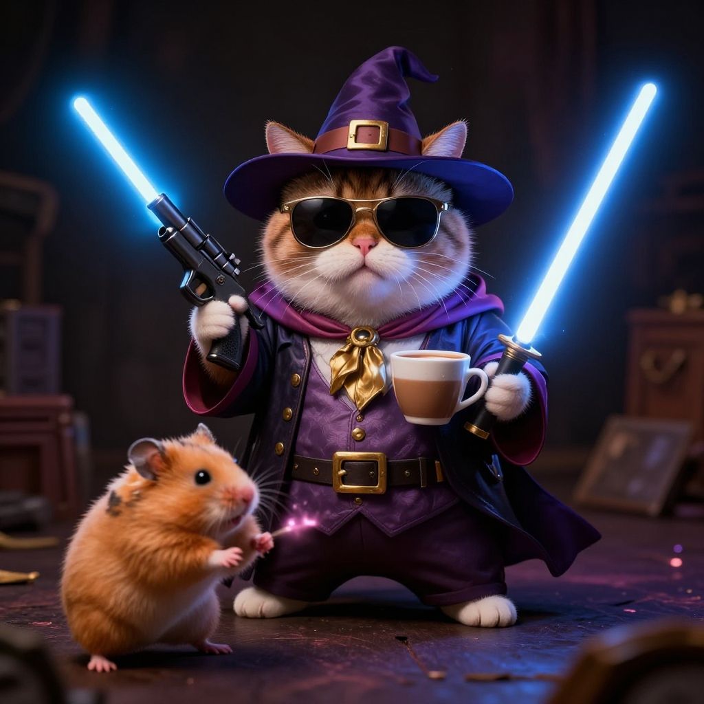 A digitally rendered, hyper-realistic image of a white and orange tabby cat dressed as a wizard. The cat wears a purple wizard hat, dark sunglasses, a purple cloak with a gold buckle, and a matching purple shirt with a gold tie. It holds a gun in its right paw and a white teacup in its left. A small brown hamster stands to the left, holding a pink sparkler. Blue laser lights create a dramatic background, with dark, blurred shelves and objects in the backdrop. The cat's expression is stoic, adding a humorous contrast to the fantastical and action-oriented scene.