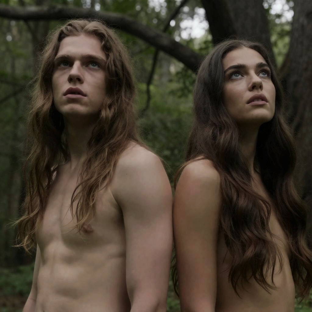 Photograph of two young, shirtless individuals with light skin and natural hair in a dense, green forest. The person on the left has short, messy blonde hair and a neutral expression. The person on the right has long, wavy red hair and a slightly intense gaze. Yellow wildflowers surround them, with green foliage in the background. Both individuals are positioned close together, facing forward.