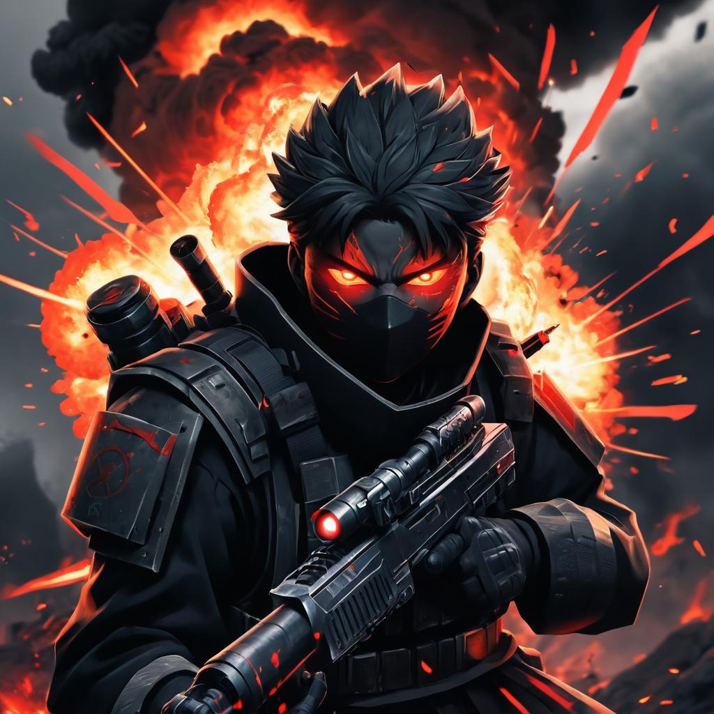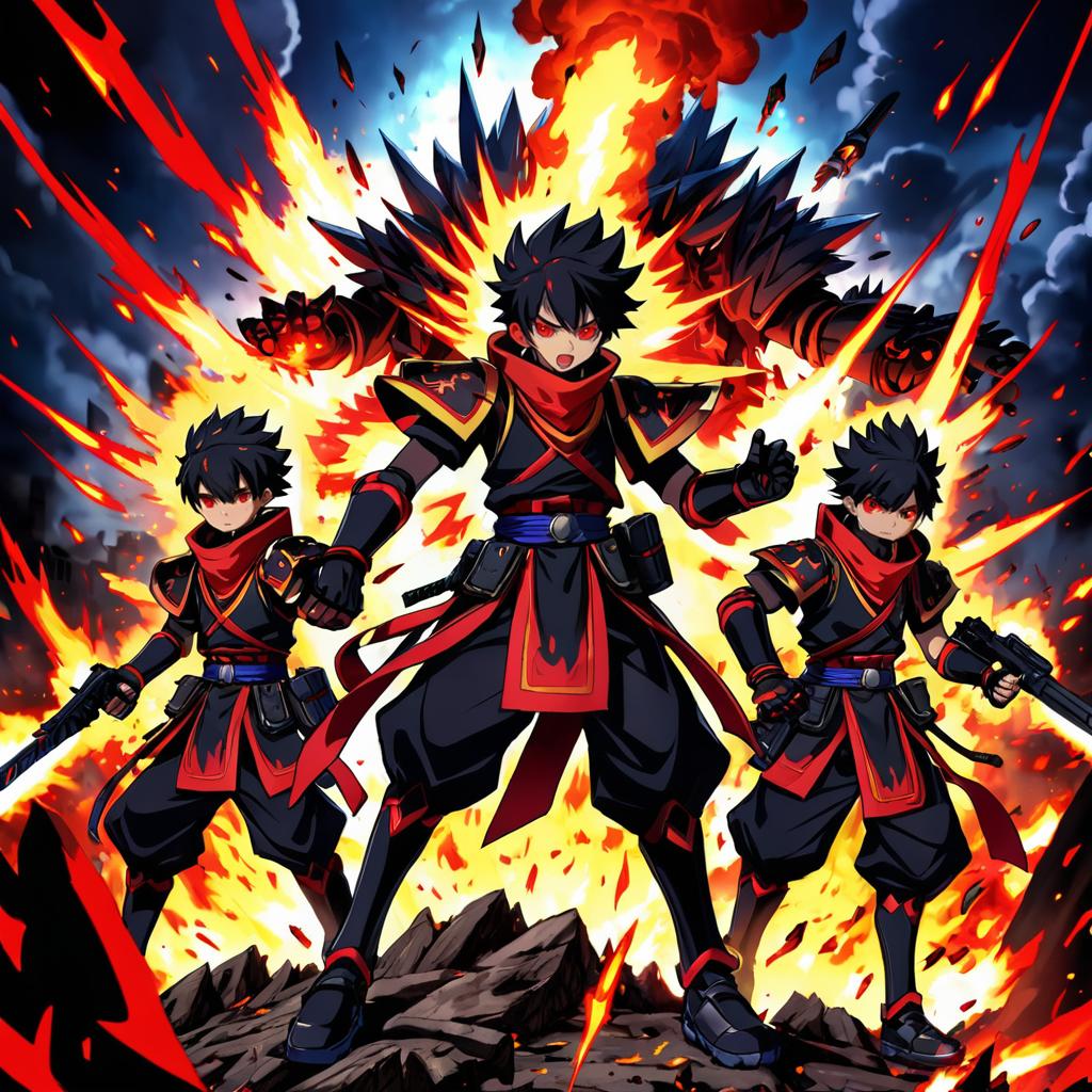 Digital illustration featuring three anime-style boys with red glowing eyes dressed in black and red battle outfits, standing on rocky terrain with intense fire and explosions in the background. The characters hold weapons, including swords and guns, surrounded by dynamic flames and sparks expressing a dramatic battle scene.