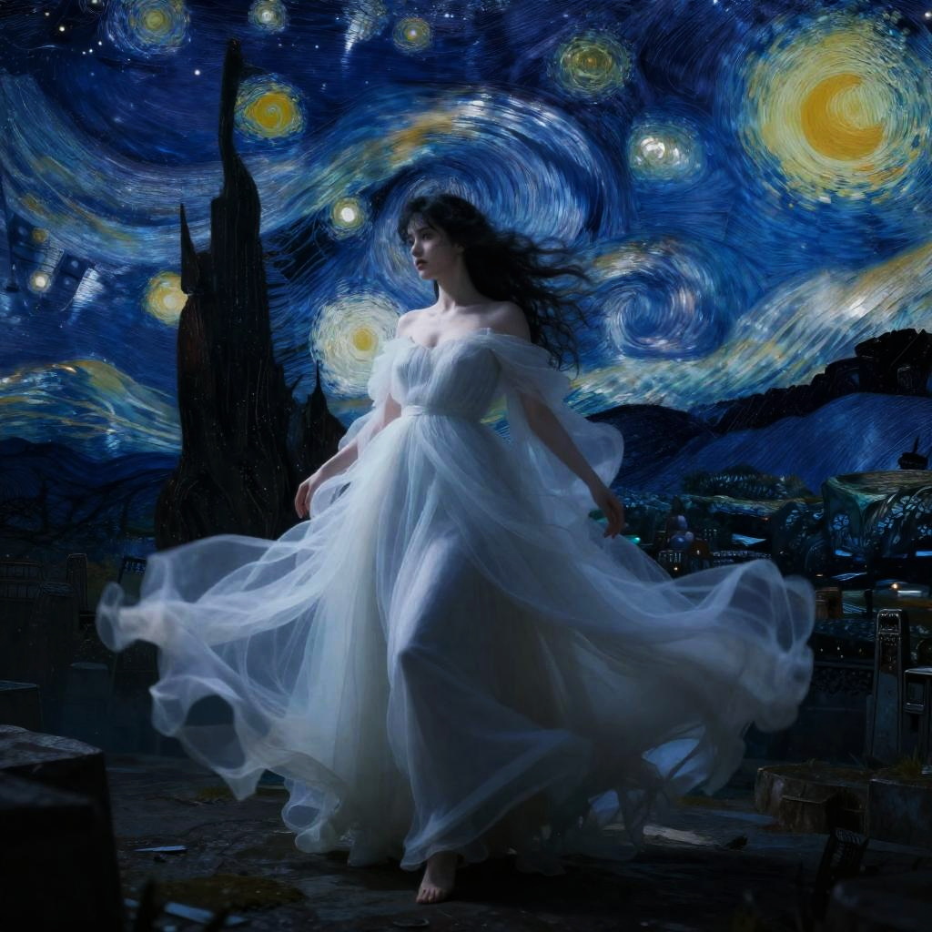 Realistic photo.Cecile Walton, surreal, mysterious, bizarre, fantastical, fantasy, sci-fi, Japanese anime, starry night in the dark, distant megalithic civilization ruins, flowing ethereal gown, perfect voluminous body, detailed masterpiece, dynamic angles. realistic photo