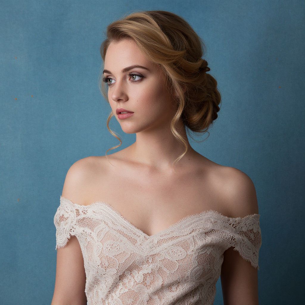 Portrait featuring a woman with golden hair styled in an elegant updo, wearing a delicate off-the-shoulder lace dress against a textured blue background with orange speckles.