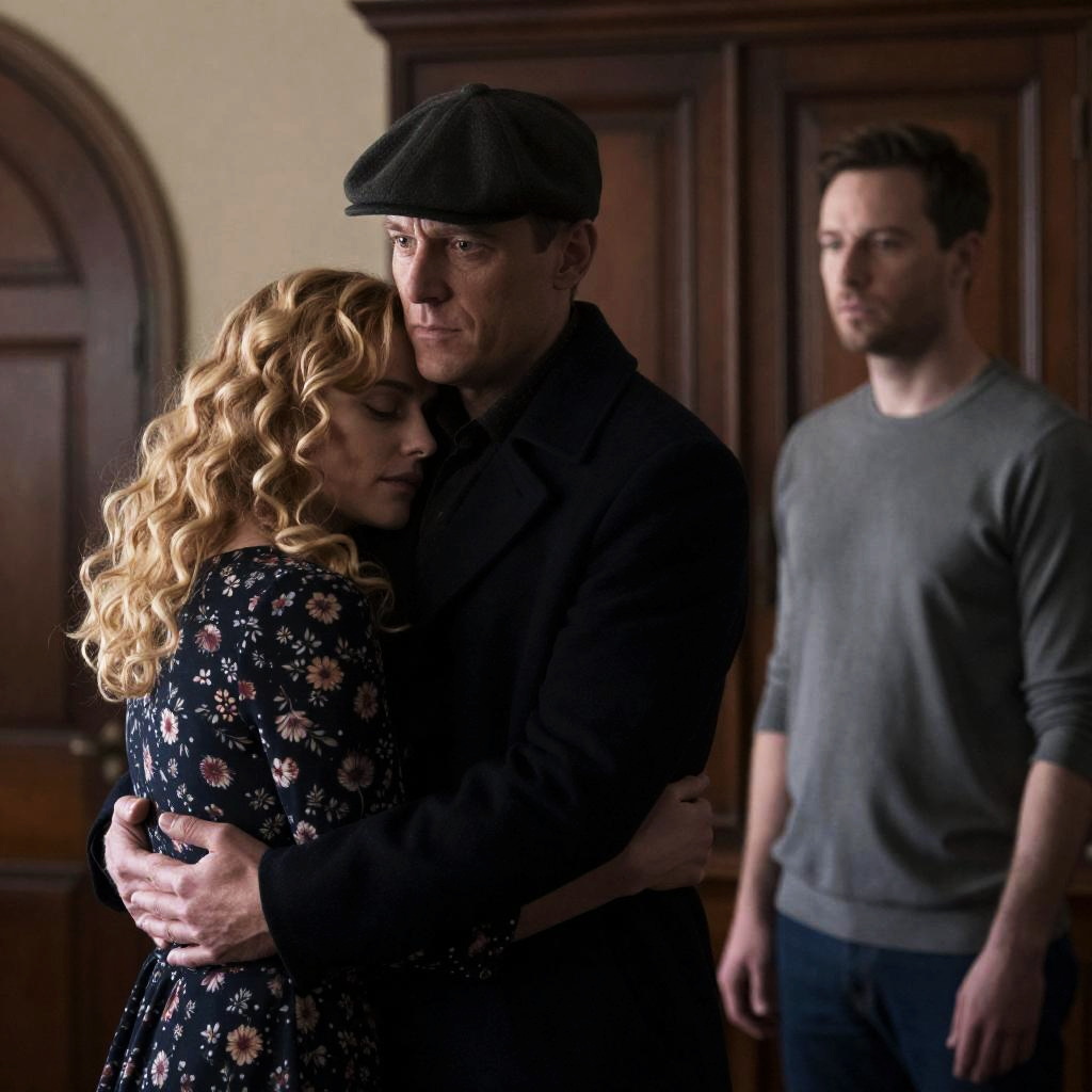 Movie poster of "A Double Life." Blonde woman with curly hair and blue dress leans over bearded man in dark coat. Intense expressions. Green and yellow color palette. Man looks up, woman gazes downward. Three headshots on left.