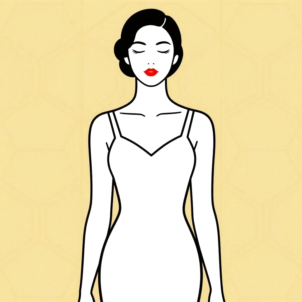 Realistic photo.Minimalist line art portrait of elegant woman with closed eyes, no gradients or fills, simple black and white with bold red lips, standing against a repeating geometric background of yellow hexagons, art deco inspired, clean lines, elegant pose, high contrast, vintage illustration style realistic photo