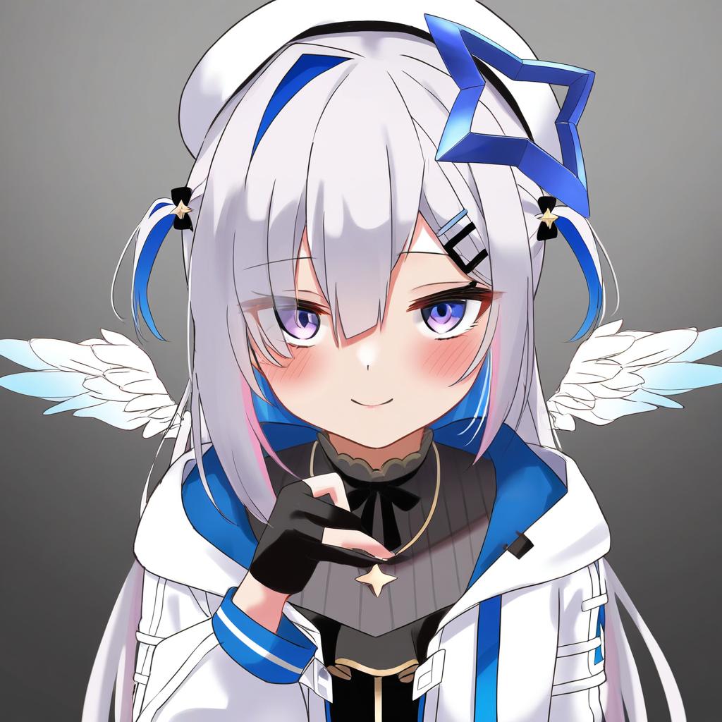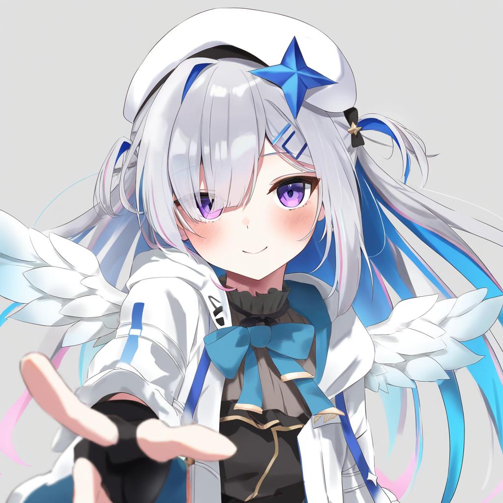 Amane kanata (work), hololive, 1girl, angel wings, angel, angel wings, purple eyes, hair over one eye, blue hair, grey hair, colored inner hair, single hair intake, official alternate hairstyle, long hair, official alternate hair length, streaked hair, pink hair, asymmetrical bangs, two side up, hairclip, black gloves, partially fingerless gloves, white jacket, black dress, white headwear, star halo, virtual youtuber, virtual youtuber, feathered wings, white wings, mini wings, feathered wings, white wings, mini wings, beret, by artist toshizou (0714), leet