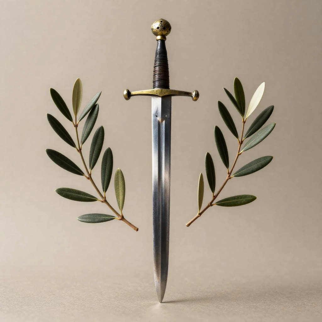 Realistic photo.War and peace depicted as broken sword and olive branch. The artwork emphasizes duality and balance in a harmonious, philosophical composition. realistic photo