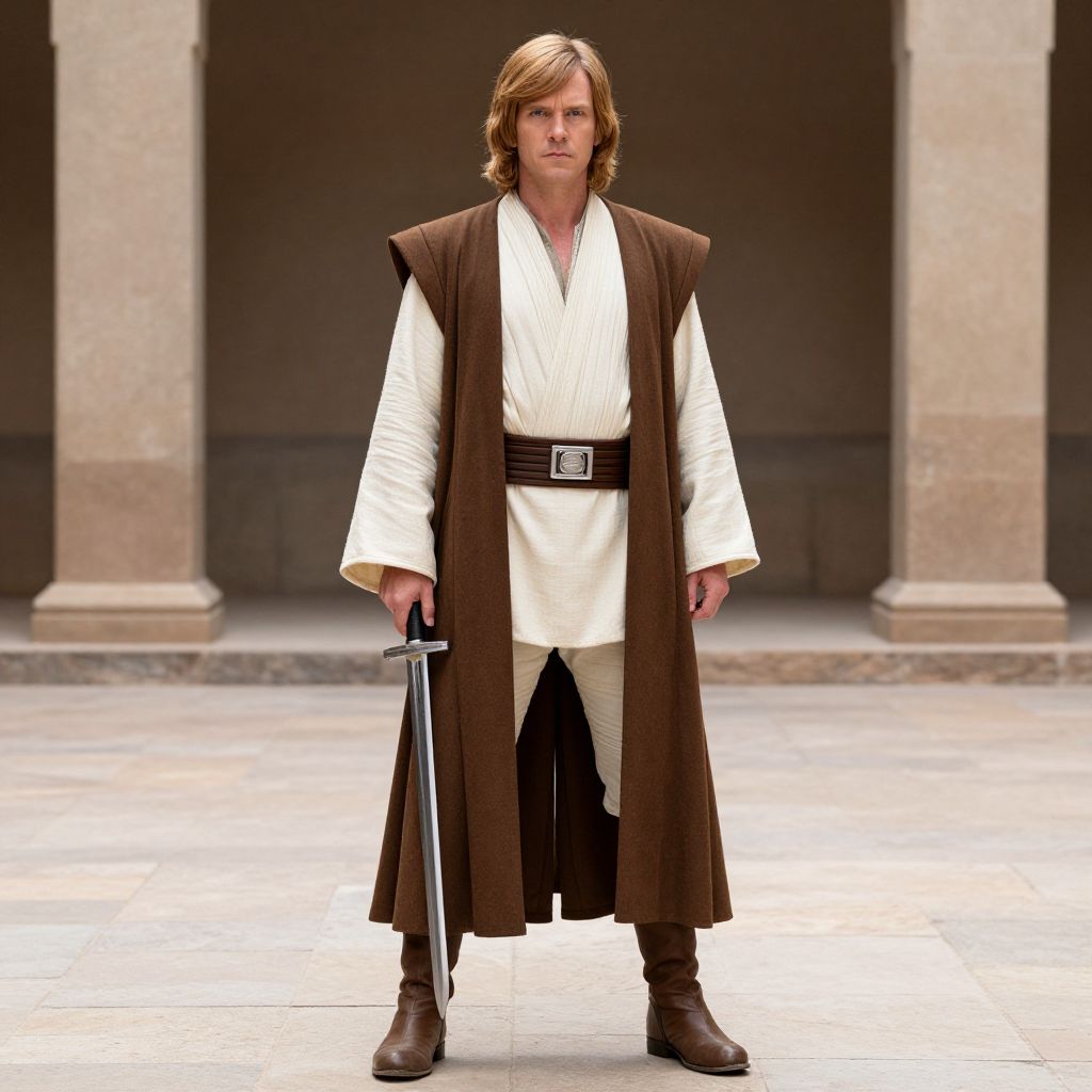 Adult Deluxe Luke Skywalker Costume, man in a robe standing in a courtyard with a sword