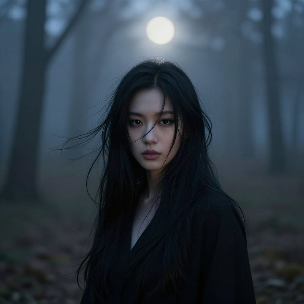 Photograph of an Asian woman with long, wind-swept black and purple hair, standing on a rainy urban street at dusk, surrounded by blurred