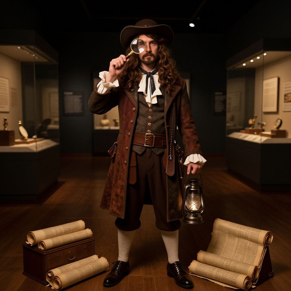 Create a night at the museum costume inspired by vintage explorers and mystical exhibits, combining rich fabrics with elaborate accessories like magnifying glasses, lanterns, and ancient scrolls, all under the soft glow of museum lighting.