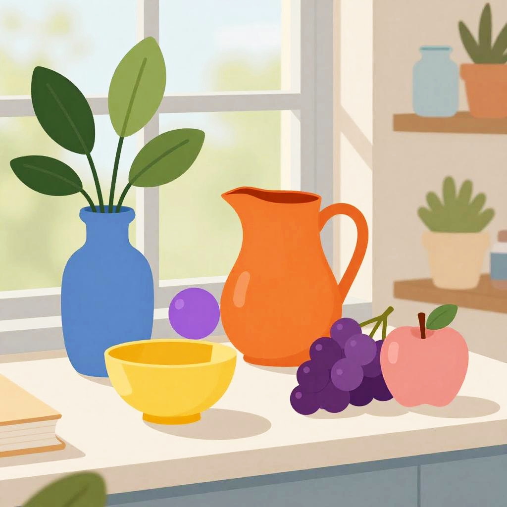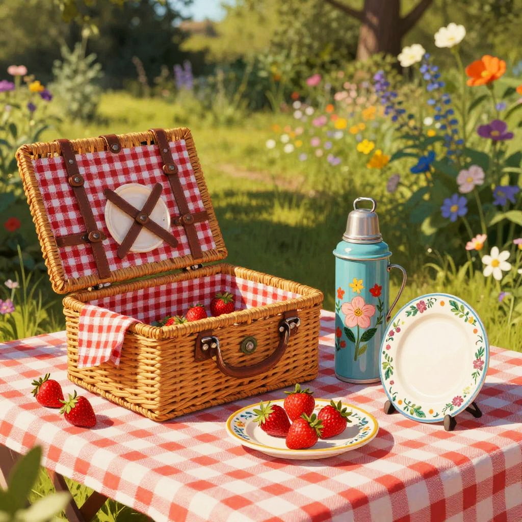 A playful, vibrant still life on an open air country garden picnic table, featuring woven picnic basket, red gingham cloth, ripe strawberries, classic thermos flask, vintage ceramic plates. Rendered in cheerful folk art scene, with warm sunlight, soft shadows, bold color blocking, tactile textures, and a softly blurred shelf of plants and jars in the background; balanced composition, cozy domestic ambiance, shallow depth of field.