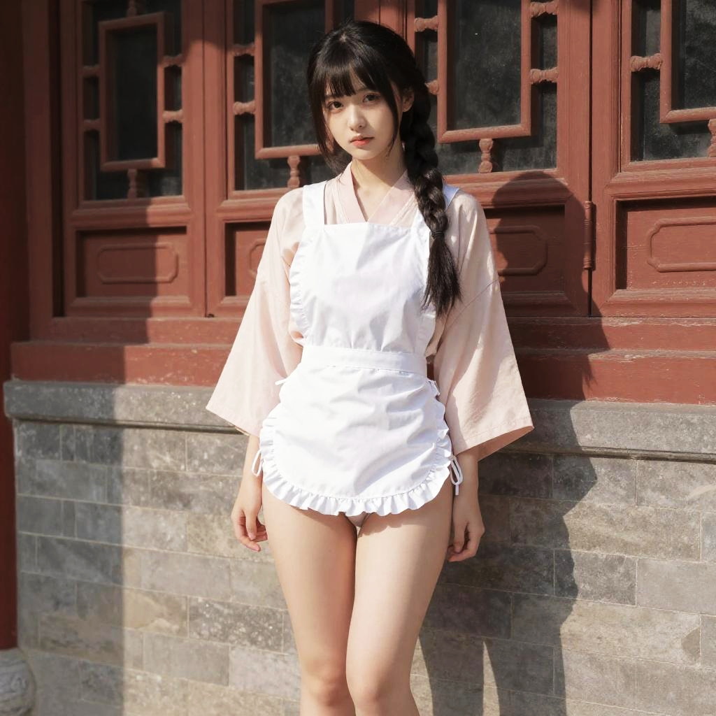 <(realistic:1.3), intricate details>, 1girl, legs, a girl at building, (((building))), braided bangs, braided ponytail, (solo:1.2), apron, thick thighs, side-tie panties, balck hair, 16yo, looking at viewer, sunlight, hanfu