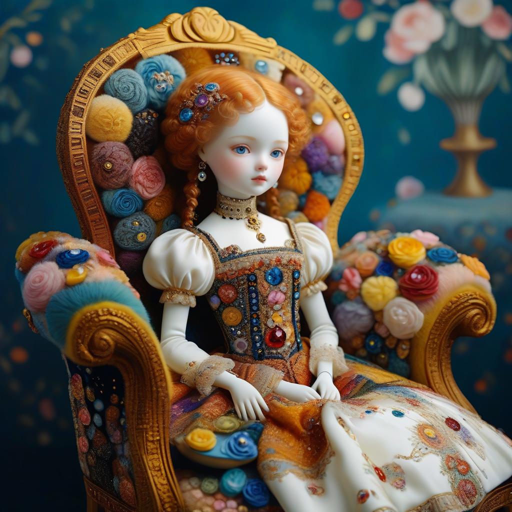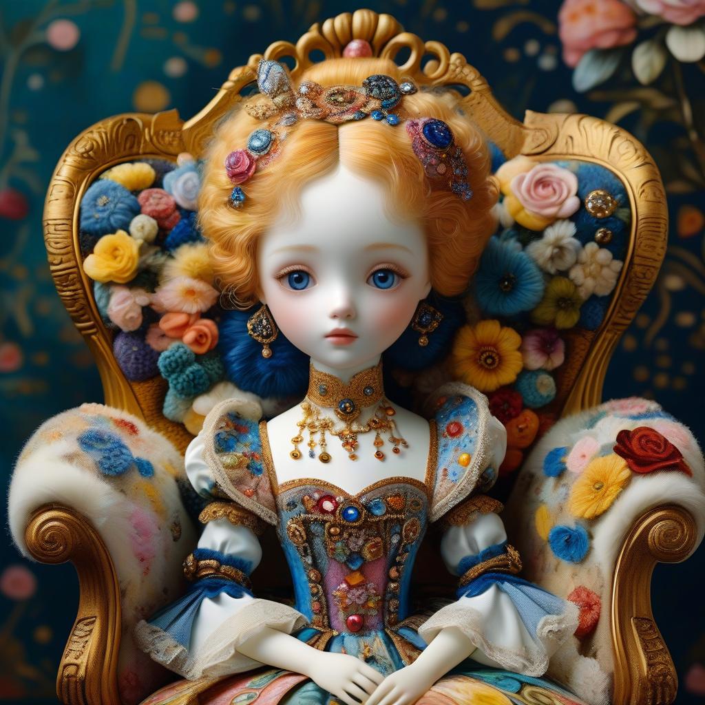 Porcelain doll with curly red hair adorned with a floral crown, dressed in an elaborate, bejeweled gown seated on an ornate blue and gold armchair. The background features a pattern of circular decorative elements in pastel tones, enhancing the artistic and luxurious aesthetic of the composition.