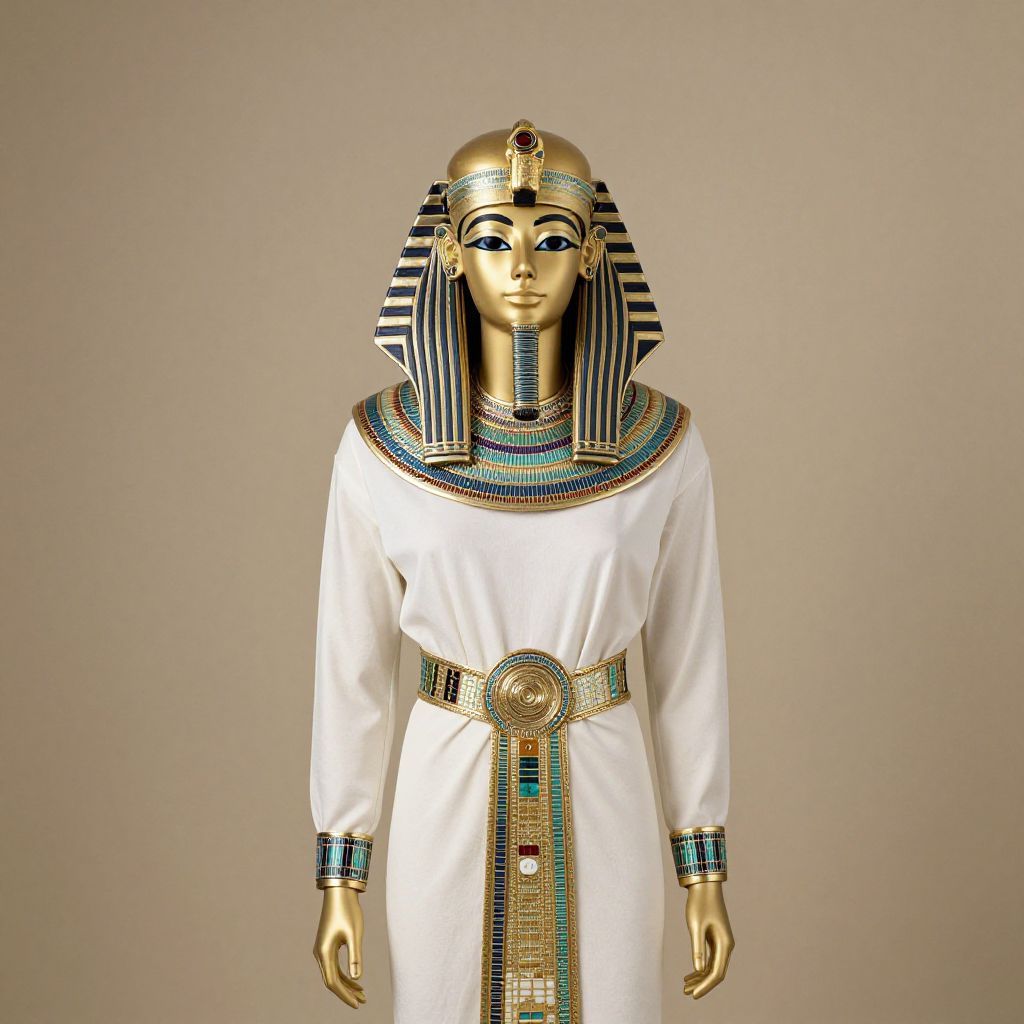 Mannequin wearing an ancient egyptian costume with a headdress and accessories.