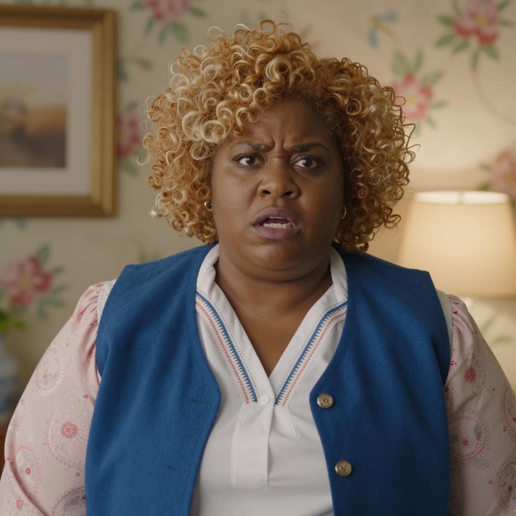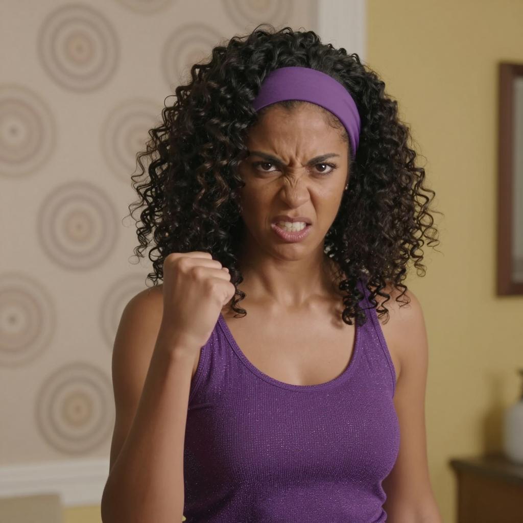 Woman with large, curly black hair and purple headband, wearing a purple, sparkly tank top, clenched fist, intense expression. Background has circular patterned wallpaper and yellow wall. Bright lighting. Upper body shot. One person.