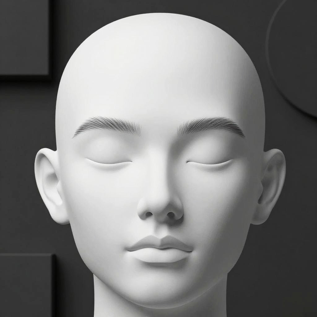 Minimalist portrait focusing on upside down eyebrows, monochrome color scheme, high contrast lighting emphasizing the eyebrow inversion, clean lines and smooth gradients, futuristic vibe with abstract geometric shapes in the background.