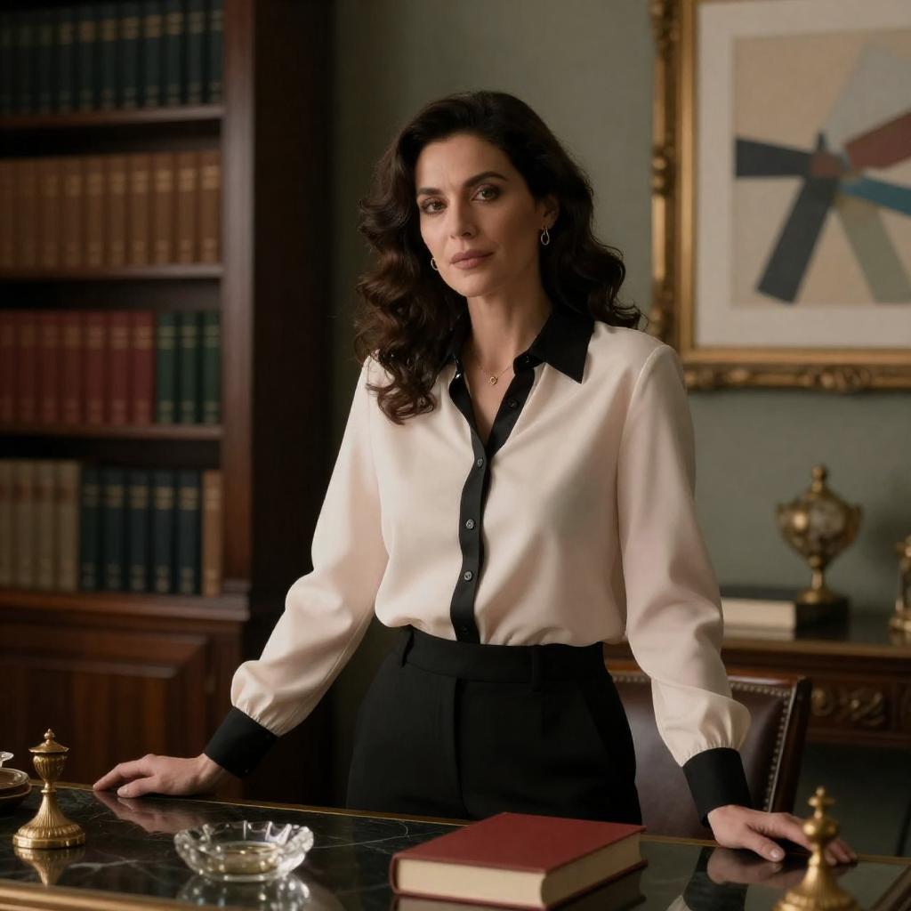 Photograph of a woman with long brown hair, wearing a brown wide-brimmed hat, white striped shirt, and brown vest, riding a black horse. She looks to the side with a neutral expression. Blurred background includes stone structures. The woman is centered, with the horse's head in the foreground.