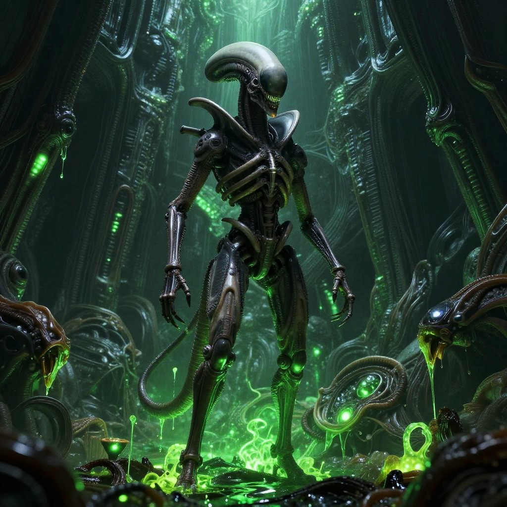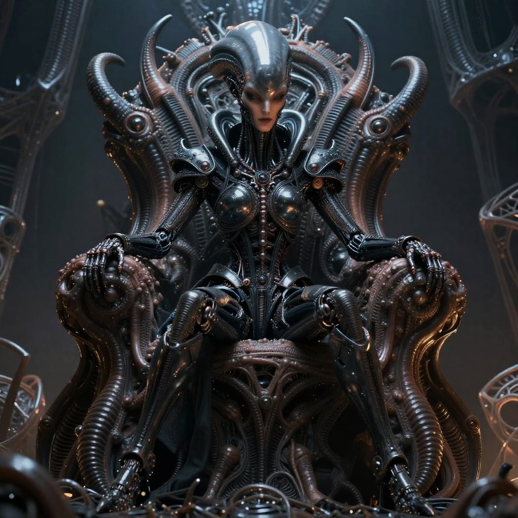 This digital CGI image depicts a highly detailed, menacing alien creature seated on an elaborate, thronelike chair. The alien has a sleek, metallic, and biomechanical appearance with a glossy, black exoskeleton adorned with intricate, ribbed textures and organic, tentacle-like appendages. Its head is elongated and featureless except for a small, red, slit-like mouth. The throne is equally elaborate, with swirling, horn-like structures and a series of mechanical and organic elements. The background is dark and shadowy, enhancing the alien's glossy, reflective surface. The overall style is reminiscent of H.R. Giger's work, blending futuristic and grotesque elements. The image is highly detailed, with a focus on the alien's menacing and otherworldly presence.