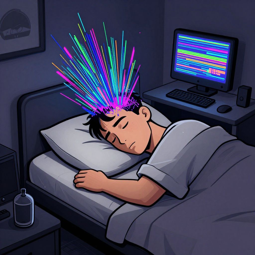 Digital illustration of a sleeping man with colorful, neon-purple and blue spikes emanating from his head, in a dimly lit bedroom with a computer displaying