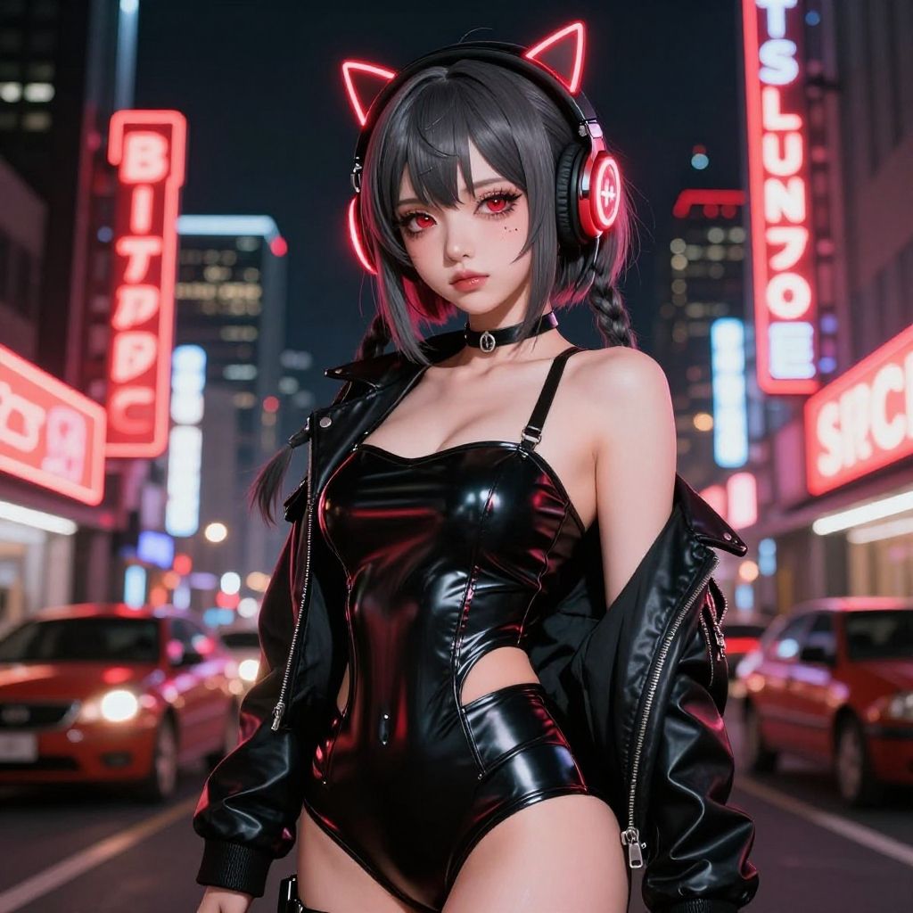 Strong red rip, kawaii 1lady 25yo eyeliner skindantation (a mole under the mouth) flat chest +++, Night:1.5 Luminous signage Glare (cyberpunk:1.5) vivid red neon_sign city Skyscraper backlighting Illumination Night view car road (black crop_leather_jacket) (((enamel_strapless enamel_hotpants))) glowing ears from nekomimi headphone, glowing pupils, +++ extremely quality extremely detailed deep-silky-healthy-lackwarm-foundational-soft-skin, illustration high resolution, contrapposto glow shine like opal, UC:realistic cute anime face cinematic angle at the front dynamic pose, +++