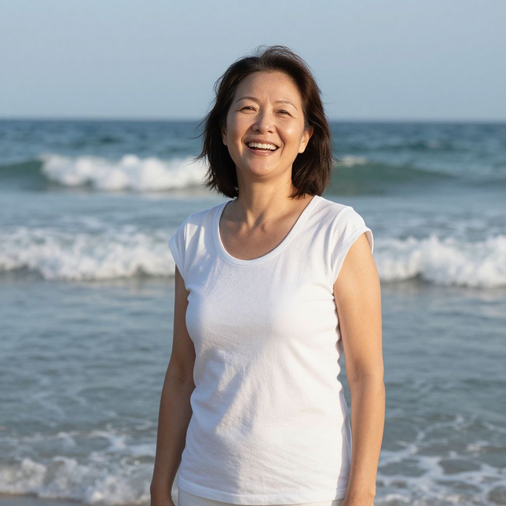 Photograph of an Asian woman standing on a beach with gentle waves in the background. She has shoulder-length black hair, light brown skin, and is smiling. She is wearing a simple, white, short-sleeved dress that appears slightly wet, clinging to her body. The ocean stretches out behind her, with small waves rolling towards the shore. The sky is clear and blue, suggesting a sunny day. The woman is positioned centrally in the image, with the ocean and sky occupying the background. Her relaxed and happy expression conveys a sense of contentment and enjoyment.