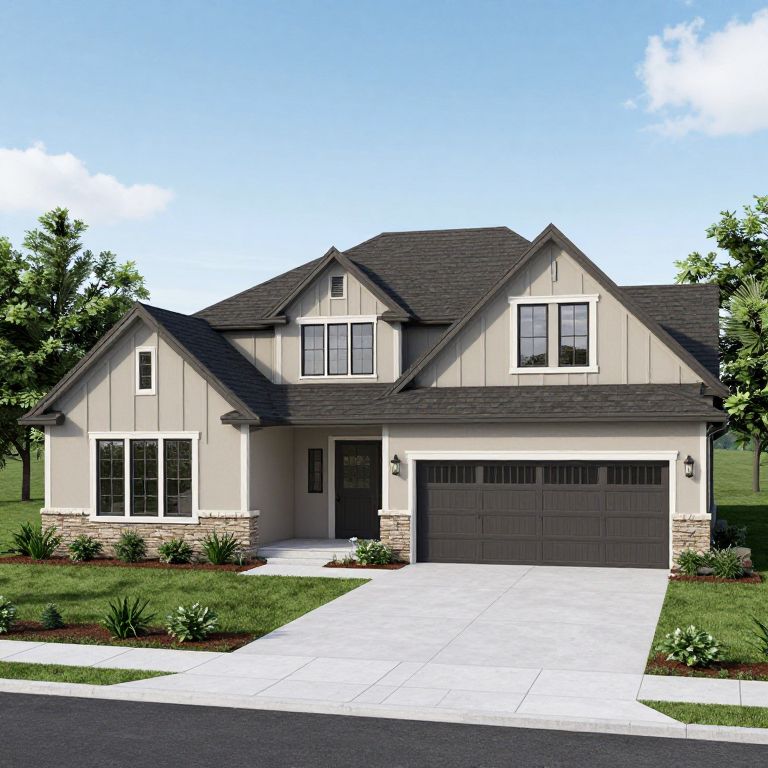 A modern ranch-style home rendered in high-definition 3D visualization showcases a spacious design with a walkout basement, three-car garage, and a welcoming front porch, blending contemporary aesthetics with classic suburban charm.