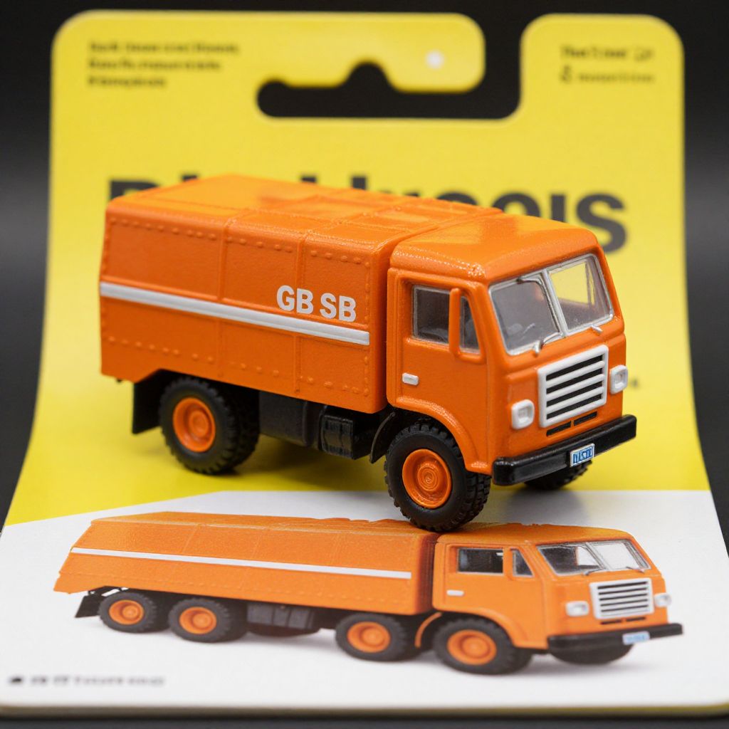 Photograph of two Lego-style plastic toy trucks in vibrant orange with black accents. The larger truck, positioned above, features a CB SB logo in white on its side, a cab with a black grille, and black tires. Below, a smaller trailer truck with a similar design is displayed. Both trucks rest on a yellow and black packaging background with partially visible black text. The scene is well-lit, highlighting the trucks' details and textures. The overall composition is clean and focused on the toy trucks.