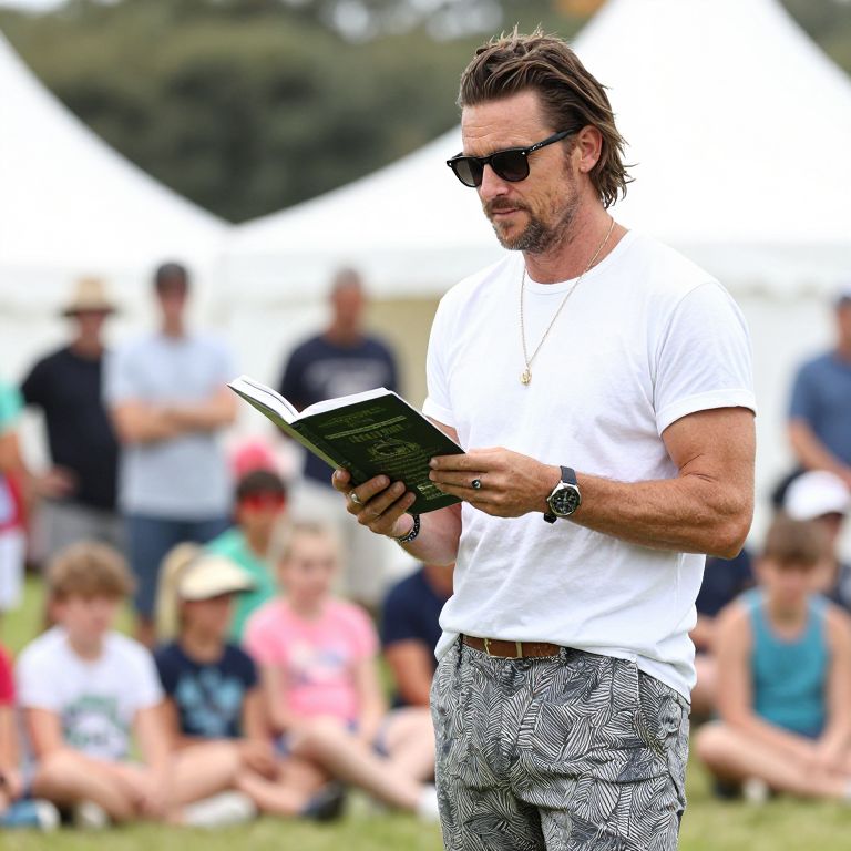 Russell Brand, 44, stands casually dressed in a white T-shirt and patterned trousers while reading aloud to families at the Port Eliot Festival in Cornwall on Saturday, his sunglasses and gold necklace adding a touch of style to his relaxed appearance.
