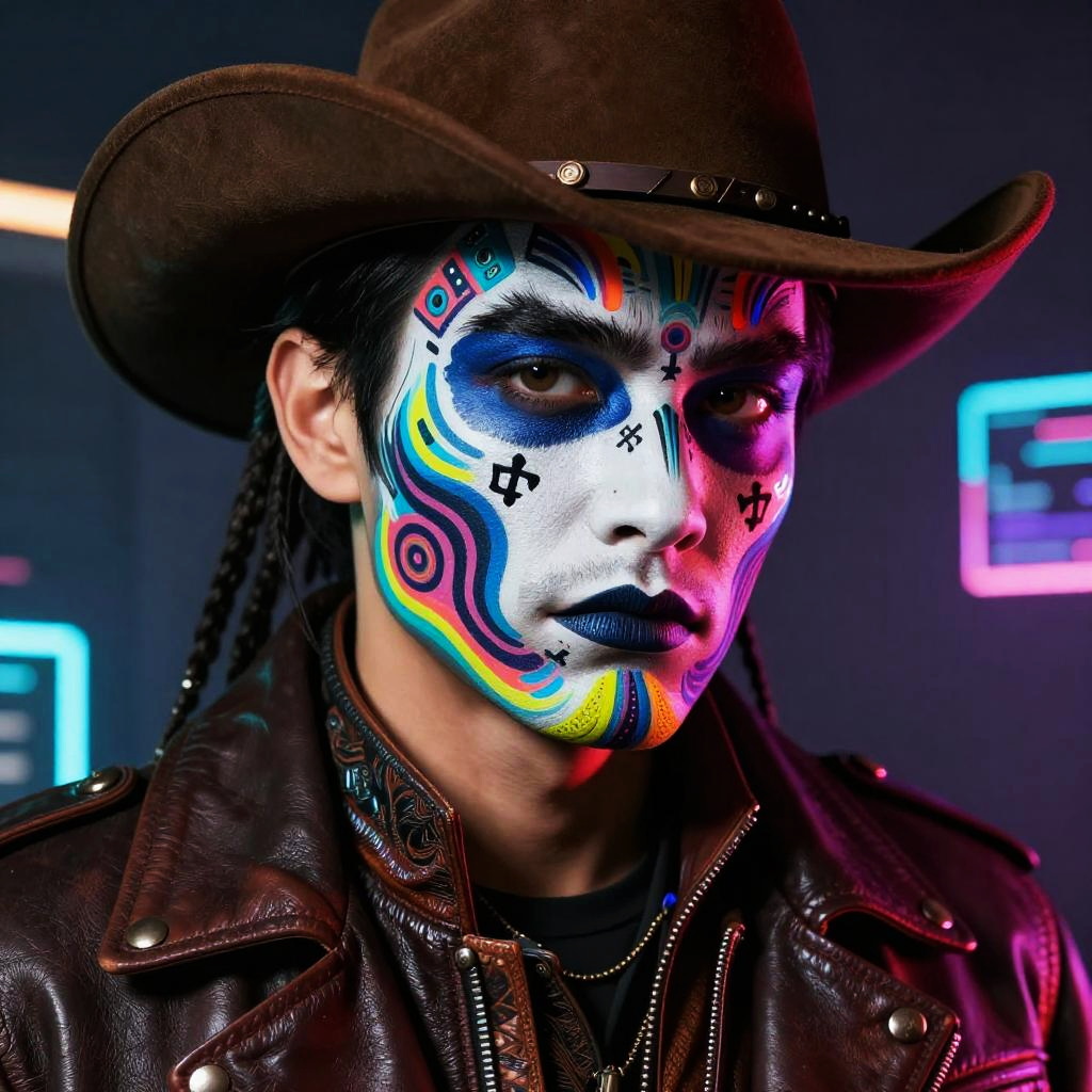 Dynamic scene of a cowboy with face paint in a wild west showdown, vibrant and abstract face paint glowing under neon lights, dramatic dust clouds, old wooden town setting, cinematic composition with a mix of realism and surrealism.