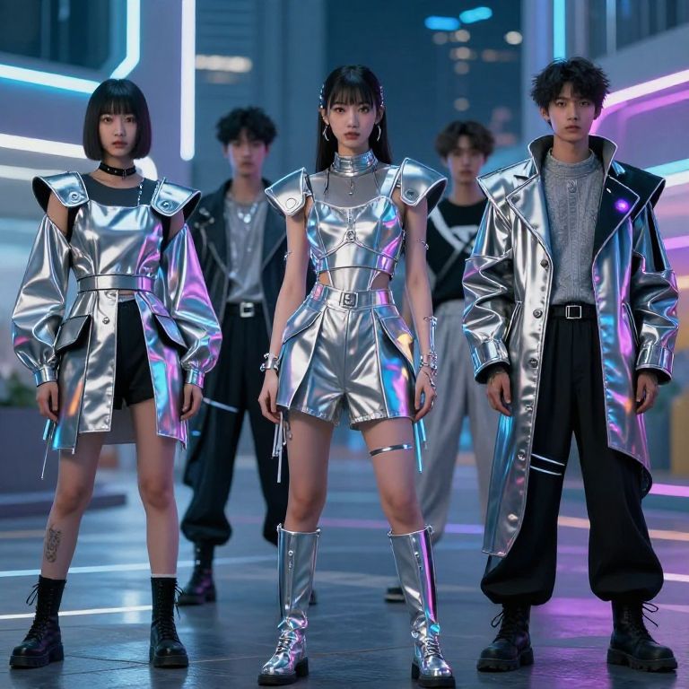 Identify clothes from picture showing a futuristic setting with individuals wearing innovative, tech-inspired garments made of metallic fabrics, glowing elements, and unconventional cuts, all set against a sleek neon-lit urban environment.