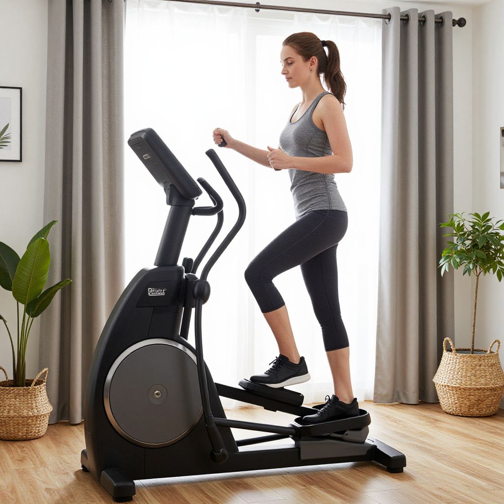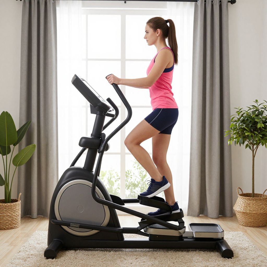 Woman exercising on a Precor elliptical machine in a well-lit home setting, featuring a large window with curtains, a potted plant, and a woven basket nearby.