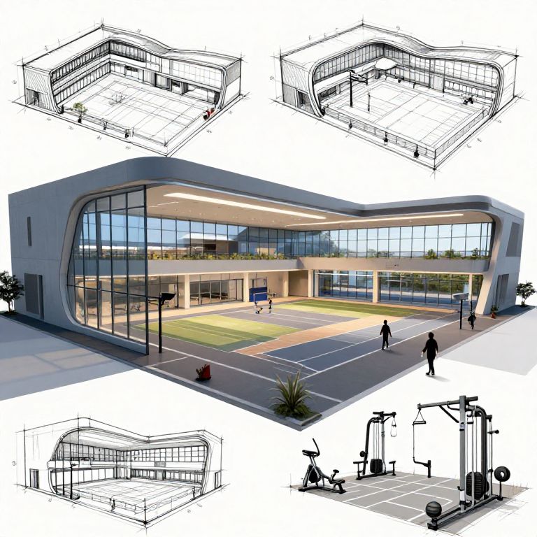 CGI architectural render of a modern, curved glass building with a sports court, detailed sketches, and gym equipment in the foreground.