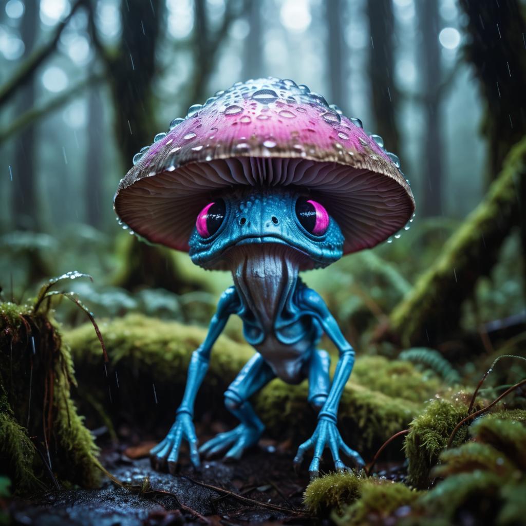 A small blue alien creature with a large mushroom cap for a head, glowing big pink eyes, standing on mossy ground in a dark enchanted forest with rain droplets, cinematic lighting highlighting the wet texture of the mushroom cap, mystical atmosphere, detailed close-up