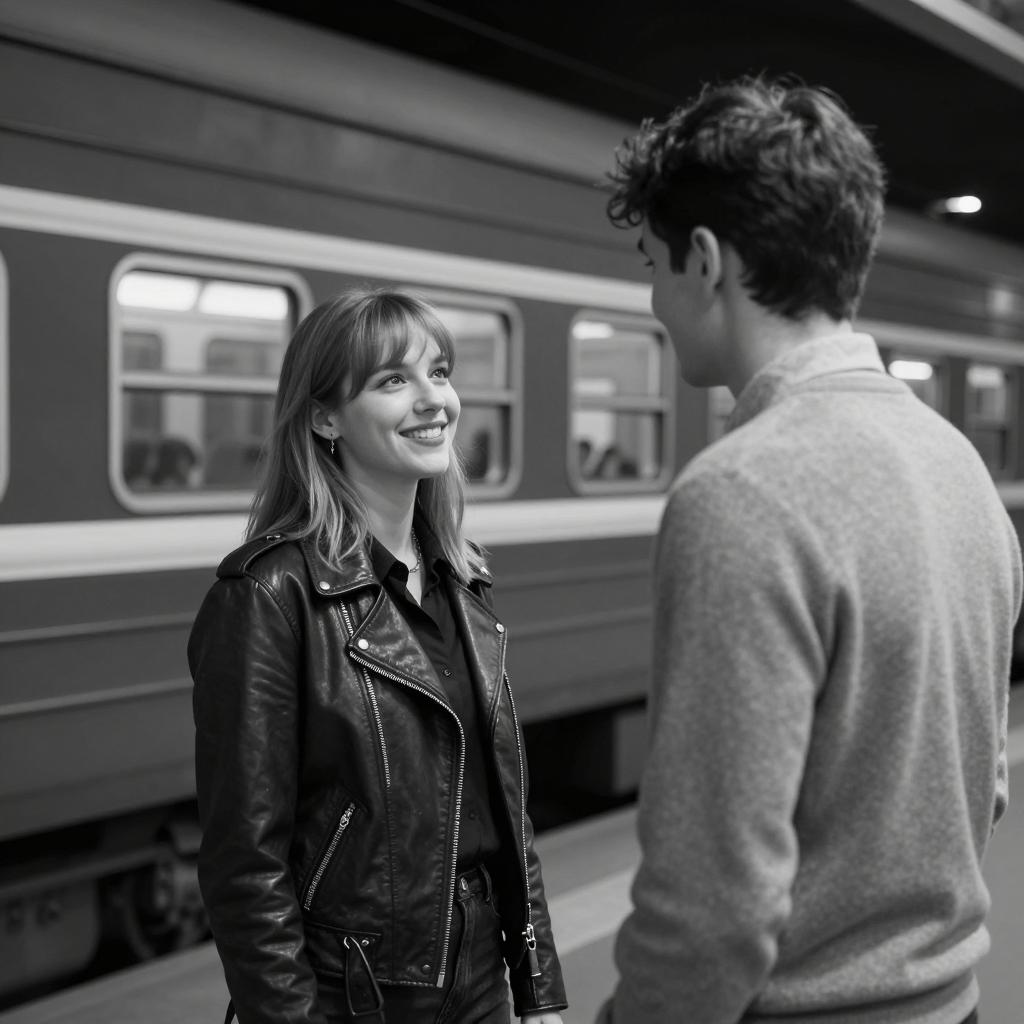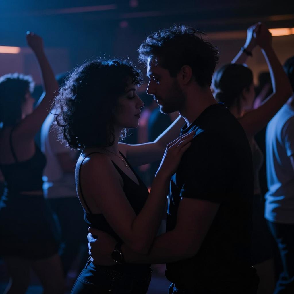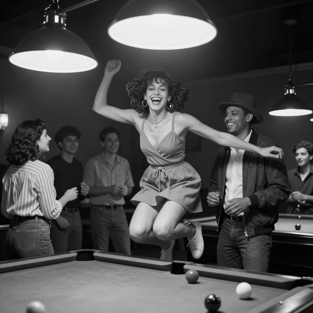 Black-and-white photo capturing a lively party scene with eight young adults. A woman with short curly hair wearing a low-cut sleeveless dress and sneakers jumps on a pool table, arms extended and smiling widely. A man next to her wears a hat, jacket, and jeans, also smiling. Other people in casual attire stand around, watching and laughing. The scene is lit by overhead pendant lights, with a smoky or misty background adding atmosphere.
