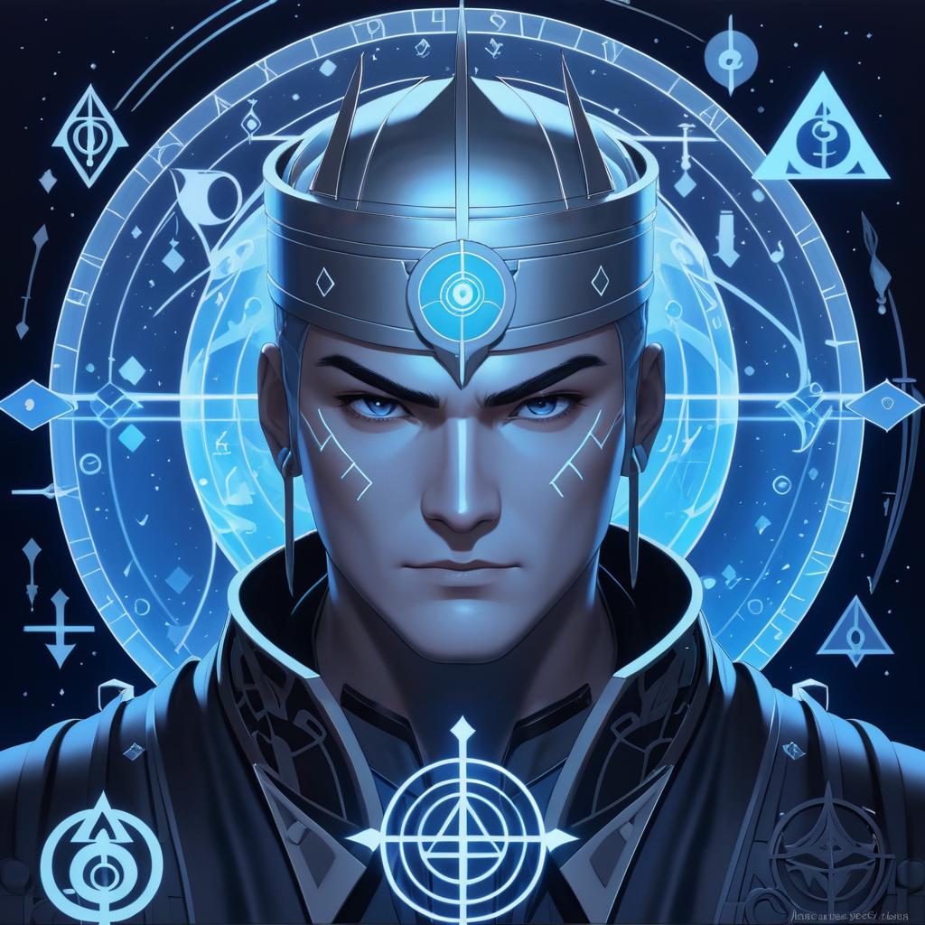 A detailed 3/4 portrait of a young man with silver hair and piercing eyes, dressed in dark futuristic armor. He is surrounded by glowing blue alchemical symbols and mystical geometric shapes, rendered in duotone acrylic style. The background features an intricate circular pattern of magical runes, creating a fantasy and sci-fi blend atmosphere.