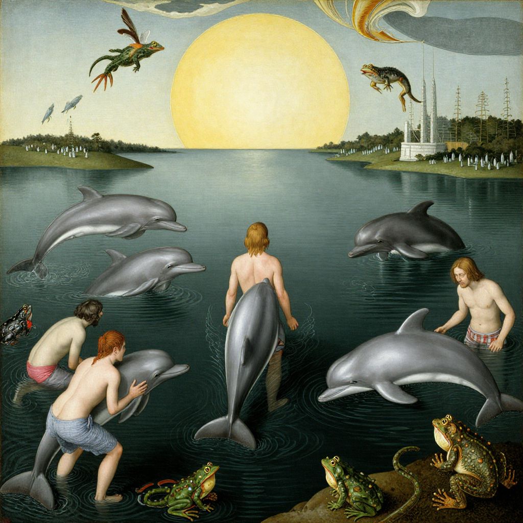 A deep lake filled with fish people, dolphins, flippers hybrid half man half fish, monstruous dolphins, lizards, toads, jumping flying and eating frogs, detail of a painting by hieronymus bosch
