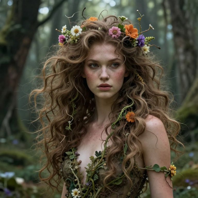 Guides a beautiful Greek female nymph rising from a forest pool, assymetrical, realistic, ultra-detailed, very high quality, hyperrealistic, 8k,