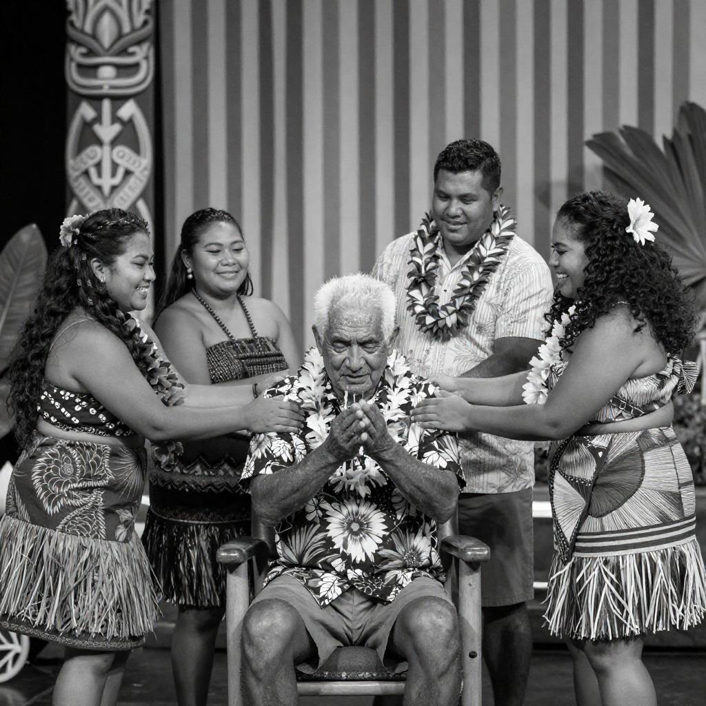 Black and white photograph of six people in a Polynesian-themed setting. Central elderly man with white hair, wearing floral shirt, being showered with leis by four women and one man. Women in traditional dresses, man in light shirt and pants. Ornate carved pillar on left, striped curtains in background. One woman sitting on chair, others standing. Expressions of joy and celebration.