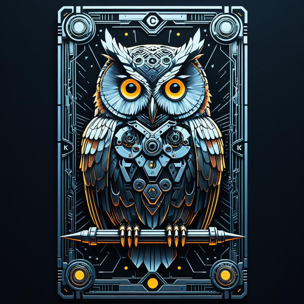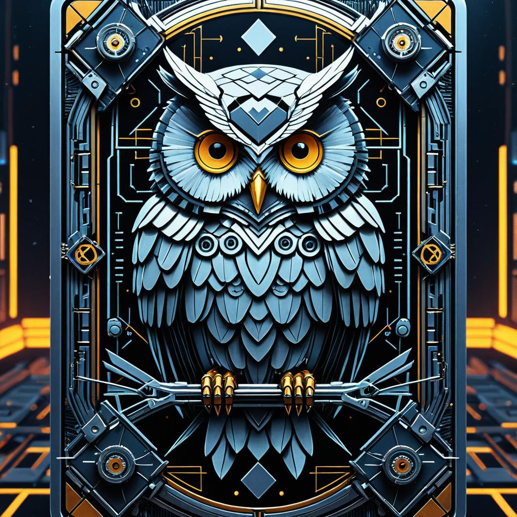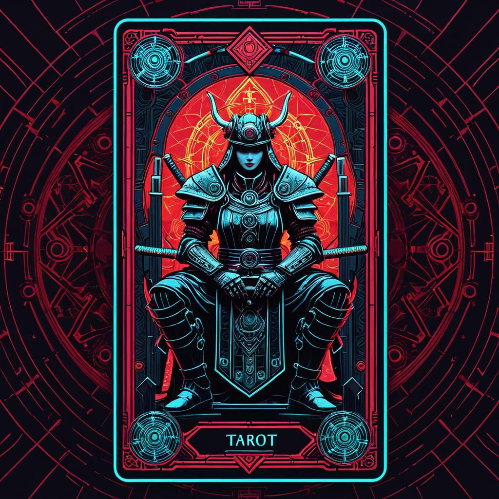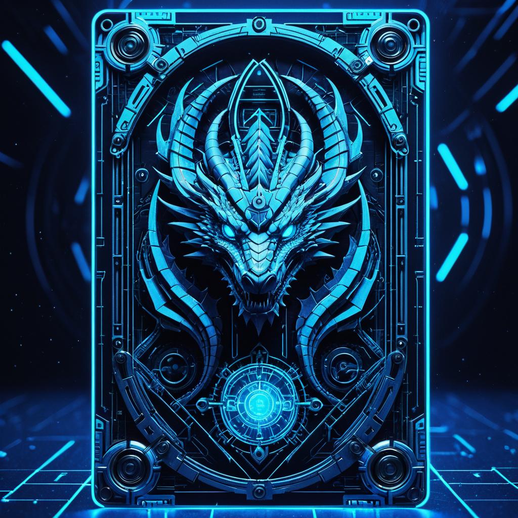 A hyperdetailed cyberpunk-themed tarot card featuring a neon cobalt blue dragon head. The dragon is enclosed in a futuristic mechanical frame with symmetrical design elements and a glowing central core. The image has a perfect structure with vibrant backlighting, inspired by the styles of Beeple, Ian McQue, and Syd Mead. Rendered in 4k HD with an octane render finish.
