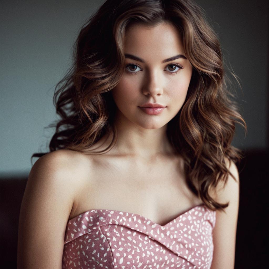 Friend movie character ,1girl, solo, dress, brown hair, pink dress, realistic, wavy hair, looking at viewer, brown eyes, lips, blurry, bare shoulders