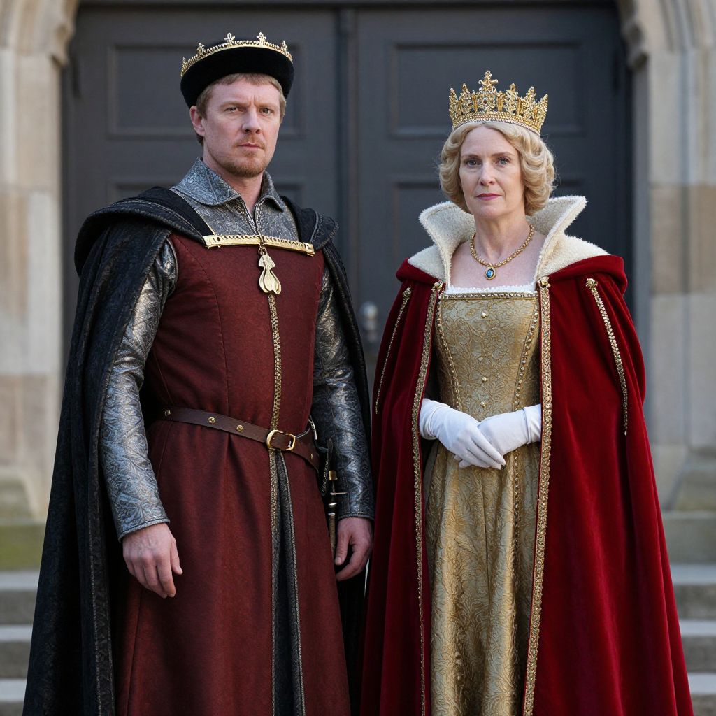 Photograph of a man and woman in medieval royal attire standing in front of a stone building with dark double doors. The man has light skin, short brown hair, and wears a black crown, silver armor, and a deep burgundy gown with a black cape. The woman, with light skin and blonde curls, wears a gold crown, white gloves, and a gold gown with a white fur collar, over a red velvet cape. Both have serious expressions and are positioned side by side. The background includes stone steps. The overall style is regal and historical.