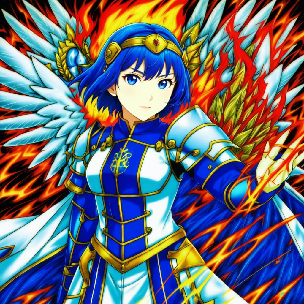 Digital anime-style artwork of a female pegasus knight with vibrant blue hair and blue eyes, wearing a detailed blue and white Pegasus Knight uniform with gold accents. She has short hair, medium build, and fingerless elbow gloves. The background features dramatic fiery flames and stylized white wings, emphasizing her magical and warrior attributes.
