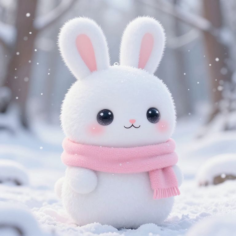 Kawaii snow bunny with big sparkling eyes and fluffy white fur, wearing a pastel pink scarf, surrounded by gentle snowfall in a magical winter forest, soft light, cute and cozy atmosphere, detailed digital art