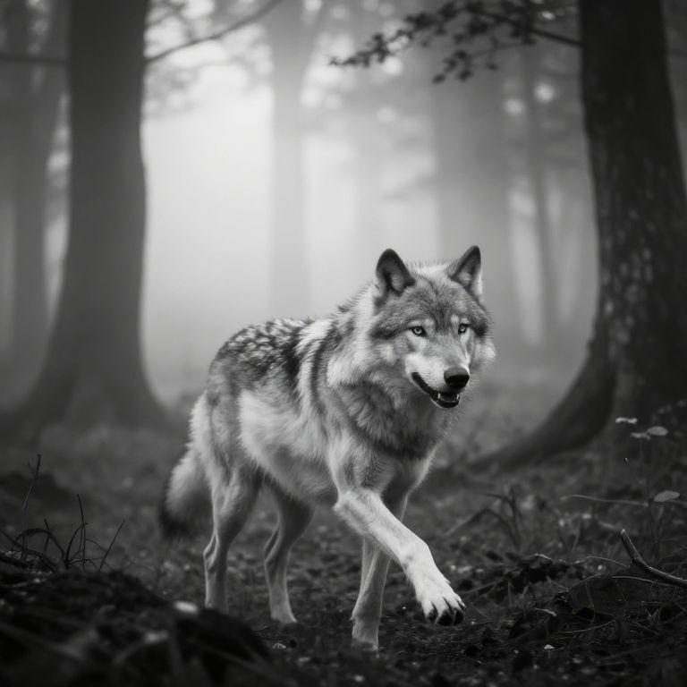Photograph of a wolf with wet, gray and white fur, running through splashing ocean waves at sunset, sunlight reflecting off its fur.