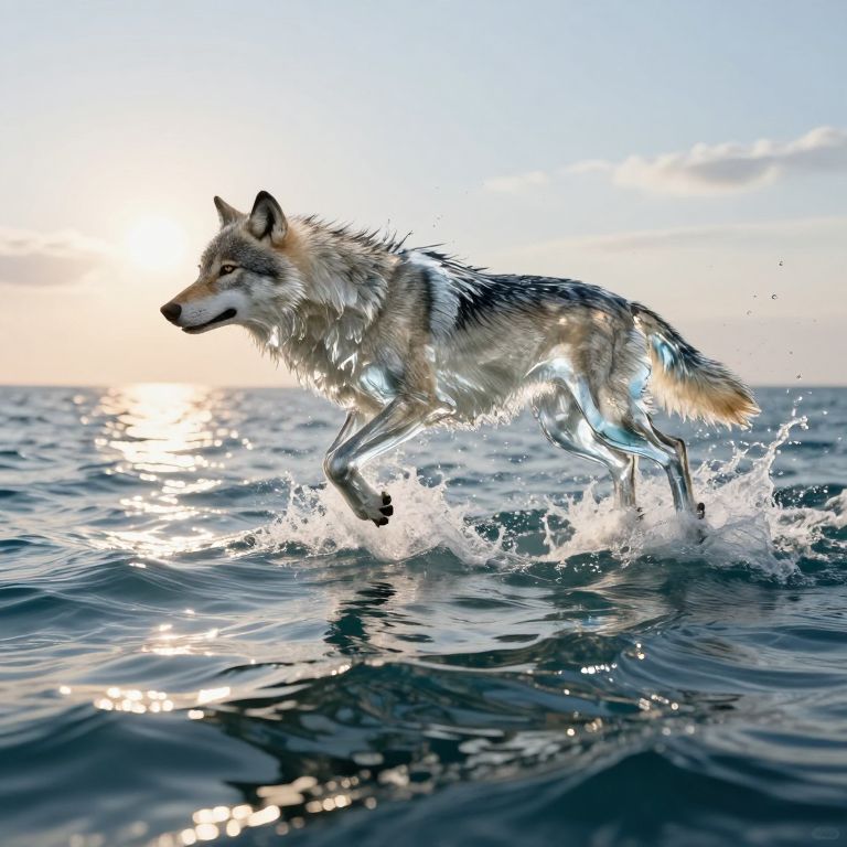 Semi-realistic, subsurface scatter, light reflection, wonderful lighting water wolf, wolf made out of water, water reflections, dynamic, made of water, transparent crafted entirely from water, light breaks in his body, super realistic waterbody, extreme realistic water, Wolf is mid jump out of the ocean but is half under water, Dynamic water, dynamic camera, landscape, ocean, open sea, realistic light breaking inside water, reflections, water reflections, light reflection, waterdrops, sun setting, sunlight, water splashing, translucent luminescence, liquid, dynamic water flow