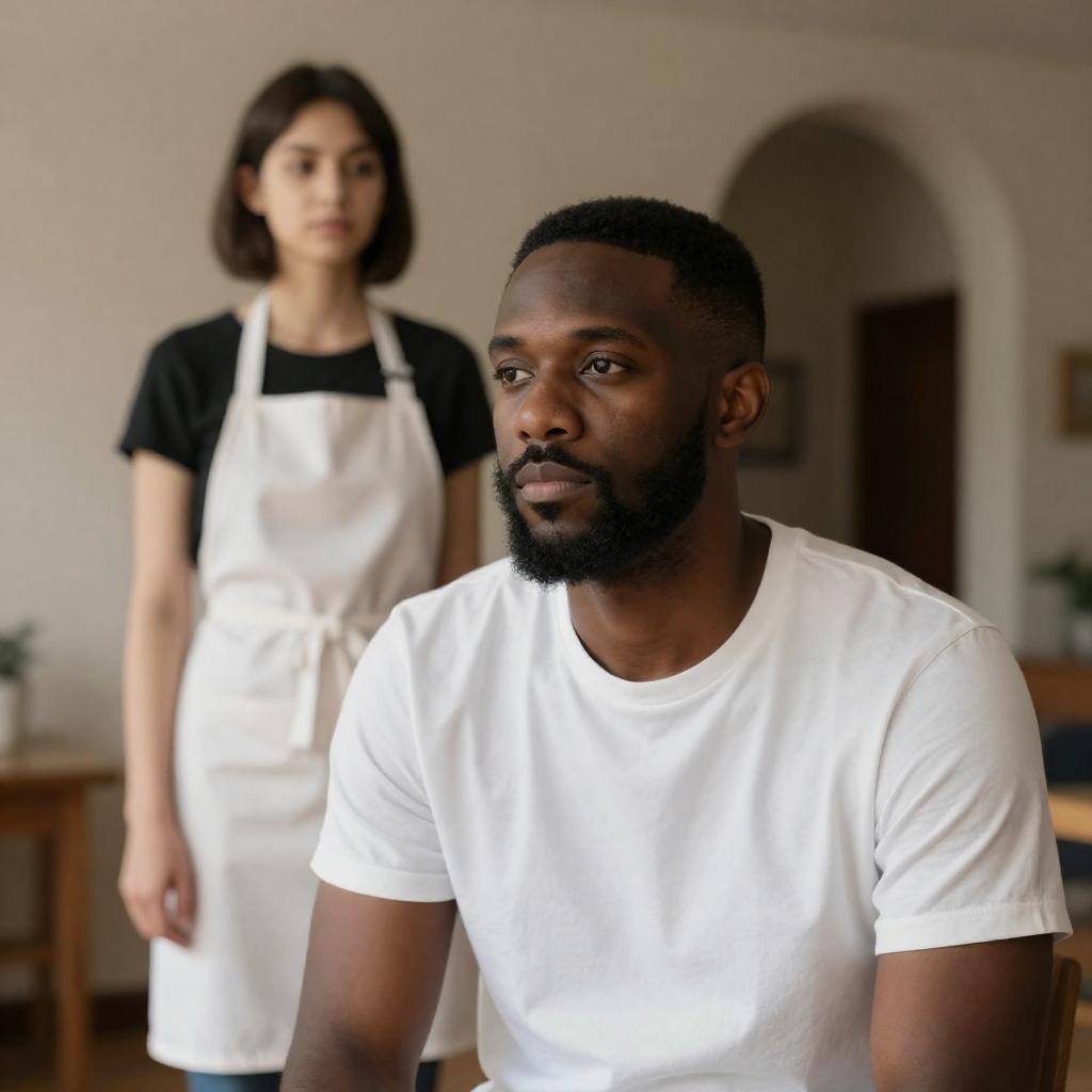 Photograph of a bald, muscular Black man in a white sleeveless shirt and pants, sitting on a bed with beige sheets, looking to the right. The background features a gray concrete wall with several small, framed photos. The bed has a metal frame with a patterned headboard. Natural light illuminates the scene.