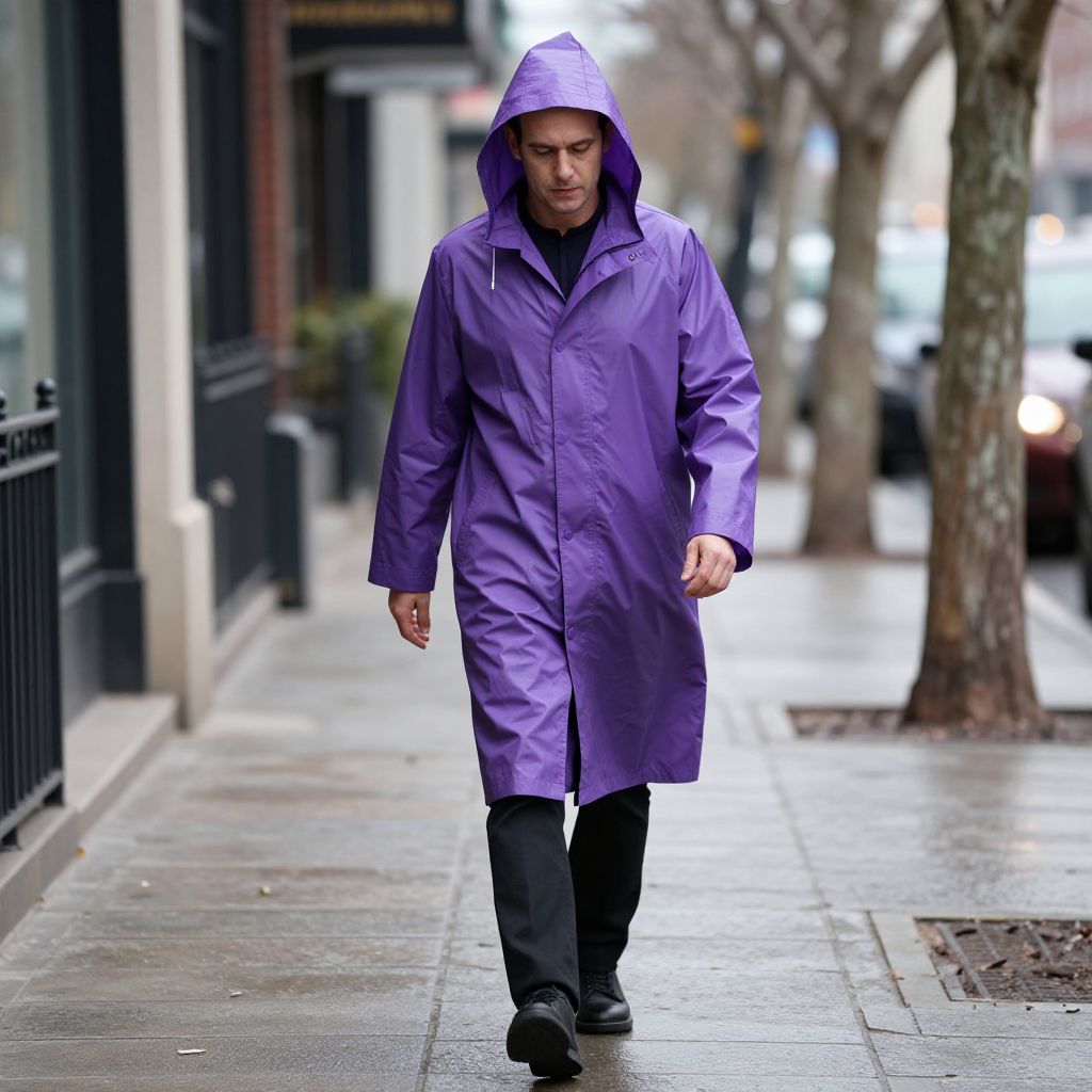 Purple Rain Costume Adult, wearing a purple rain coat walking down a sidewalk