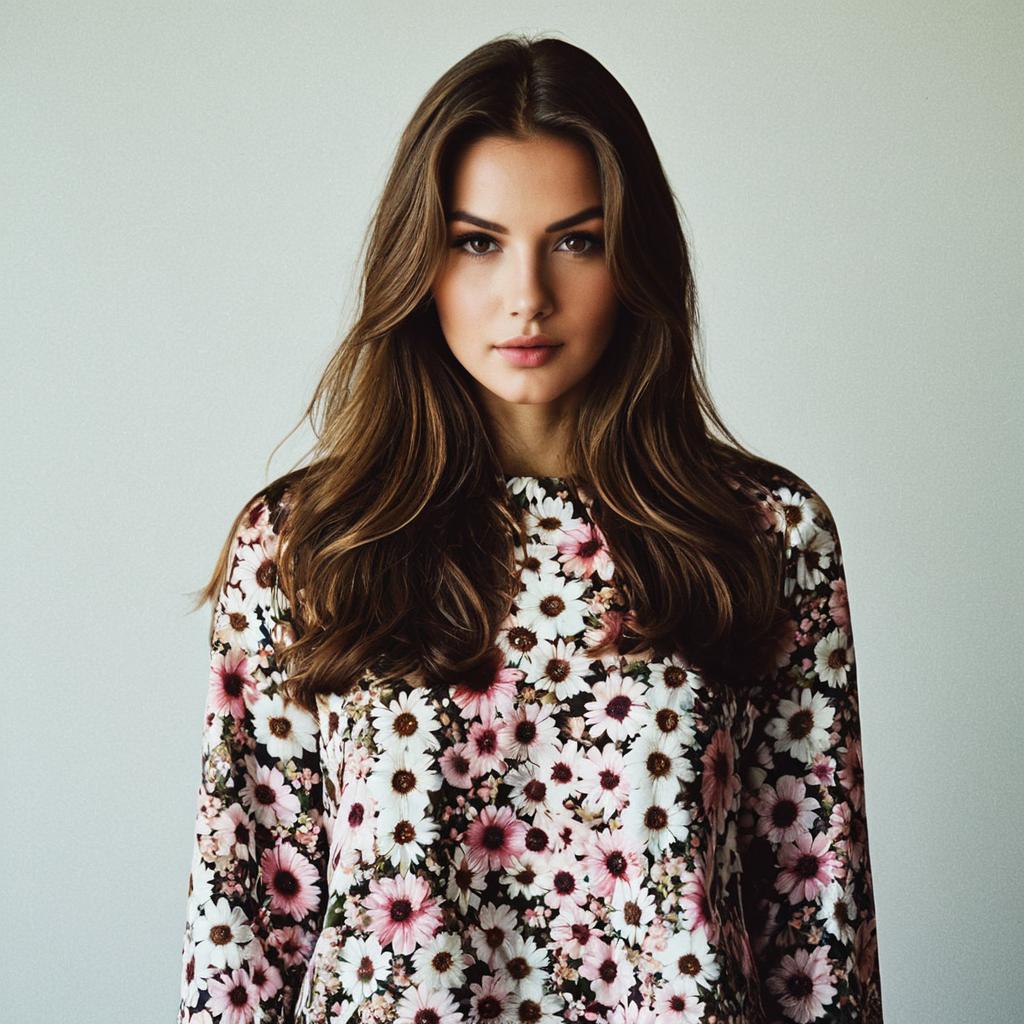 Floral outfit woman,solo, 1girl, flower, brown hair, floral print, looking at viewer, long hair, long sleeves, brown eyes, standing, arms at sides, pink flower, white flower
