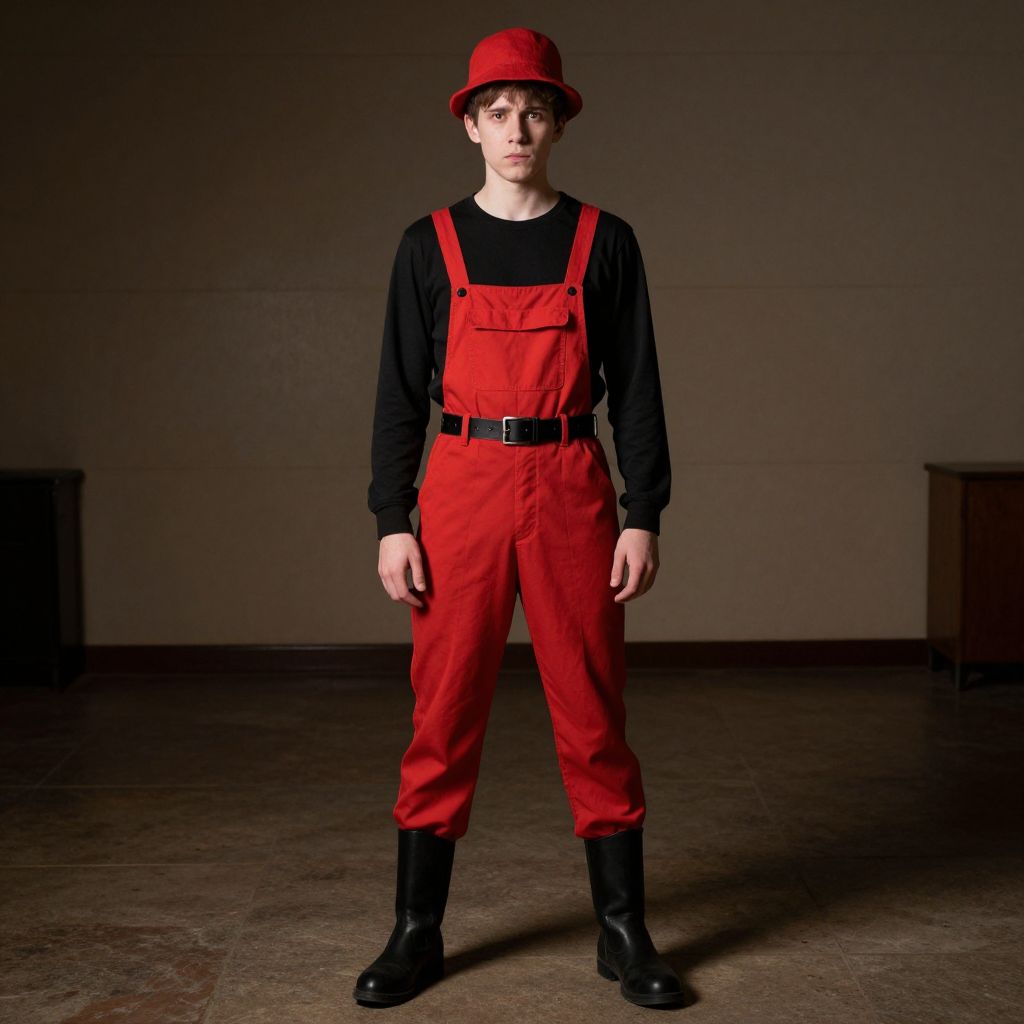 Horrible costume, solo, 1boy, male focus, standing, boots, full body, long sleeves, red pants, belt, looking at viewer, pants, indoors, closed mouth, hat